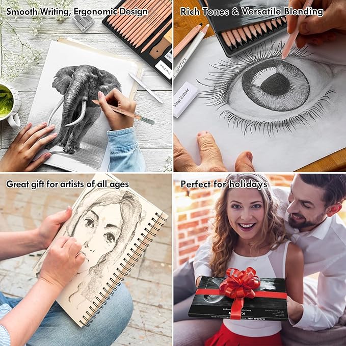 - Professional Sketch Pencils: Features smooth, uniform graphite pencils (5H, 4H, 3H, 2H, HB, B, 2B, 3B, 4B, 6B, 8B, 10B, 12B, 14B), 3 charcoal pencils (soft, medium, hard), and 2 white charcoal pencils. Non-toxic and eco-friendly. Great for adding depth and dimension to your drawings.
