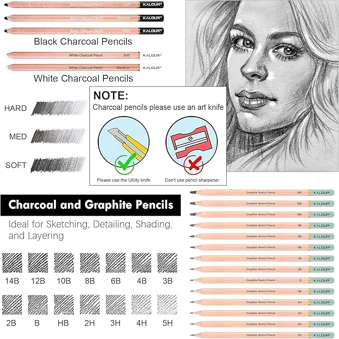 - Complete Drawing Pencil Set: Includes 14 graphite pencils (5H–14B), 3 black charcoal pencils, 2 white charcoal pencils, 1 eraser brush pen, 4 willow sticks, 3 graphite sticks, 3 charcoal sticks, 3 blending stumps, 1 sandpaper block, 1 pencil extender, 1 art knife, 1 metal sharpener, 1 vinyl eraser, and 1 kneaded eraser.
