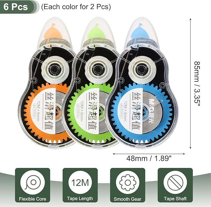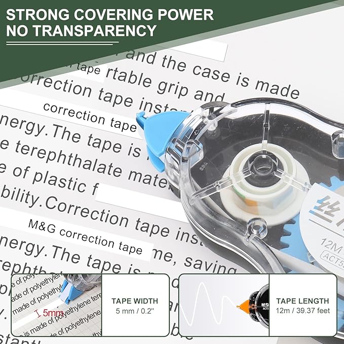 - 【Tear-resistant tape】M&G uses upgraded PET transparent correction tape, no breakage, no wrinkles, strong coverage. The tape is clean and not easy to break. Tape Width: 5mm / 0.2 inch; Tape Length: 12 m / 39.37 ft; Packing List: 6 x Correction Tape