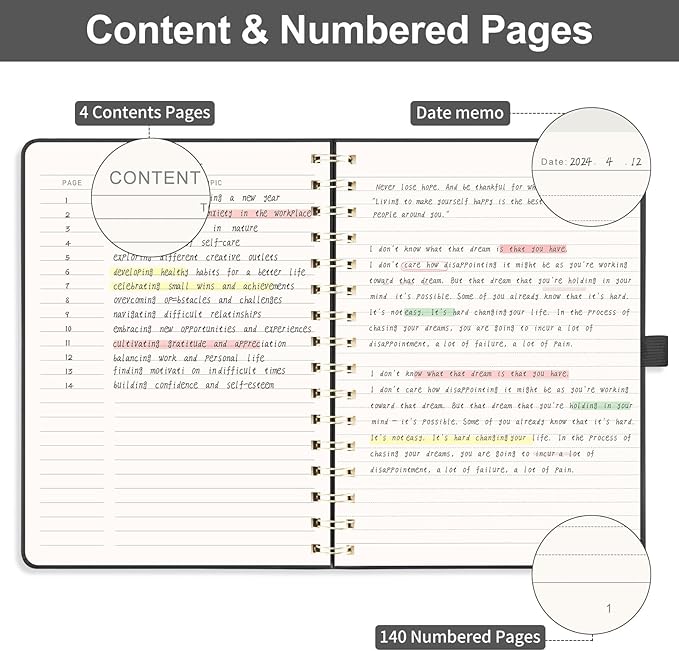 - AMPLE WRITING SPACE: A4 size (8.5"x11") with 7mm lined pages offers a large writing area. Includes table of contents and numbered pages for easy organization, perfect for work task planning or personal journaling.