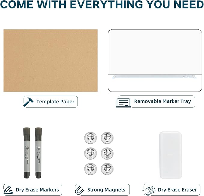- 【ACCESSORIES INCLUDED】: The package includes 2 dry erase markers, 6 magnets, 1 glass whiteboard eraser and 1 removable aluminium marker tray for mounting. One-stop shopping. It's a great gift idea for your workmate, boss or spouse which can enhance the office/ house atmosphere