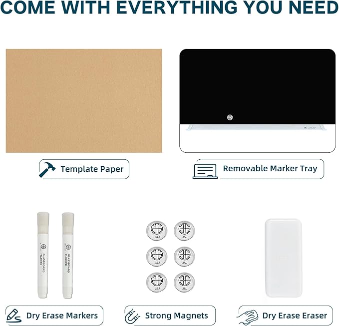 - 【ACCESSORIES INCLUDED】: The package includes 2 dry erase markers, 6 magnets, 1 glass whiteboard eraser and 1 removable aluminium marker tray for mounting. One-stop shopping. It's a great gift idea for your workmate, boss or spouse which can enhance the office/ house atmosphere