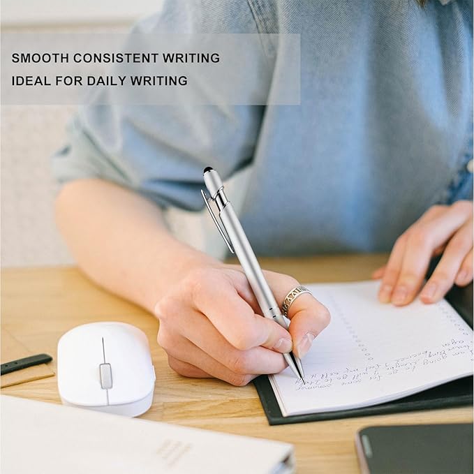 LINFANC 12 Pack Silver Ballpoint Pen with Stylus Tip, 1.0 mm Black Ink Smooth Writing Pens, Metal Stylus Pens for Touch Screens