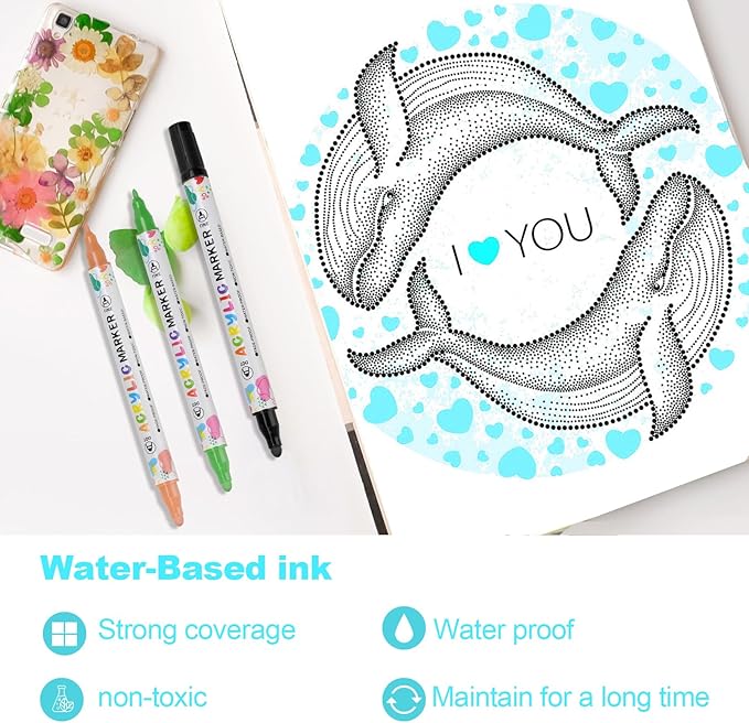 - Strong adhesion acrylic markers for Multi-Surface Any Project ---- Designed to perform on paper, fabric, wood, metal, glass, rock, and ceramic, these water-based markers provide consistent, fade-resistant, Waterproof and anti shedding, letting you create with confidence across multiple surfaces.