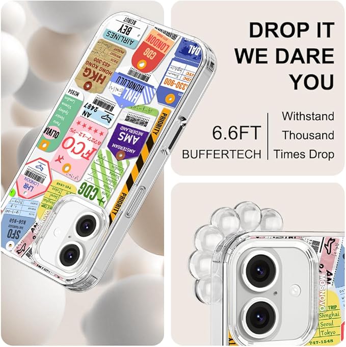 MOSNOVO Case for iPhone 16, [Buffertech 6.6ft Military-Grade Drop Protection] [Anti Peel Off Tech] Clear TPU Bumper Phone Case Cover Design - Air Ticket Labels