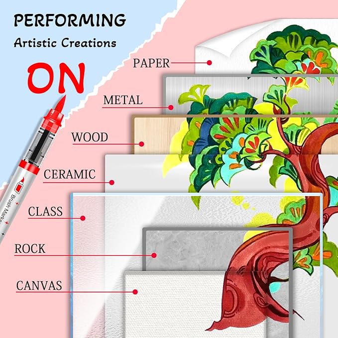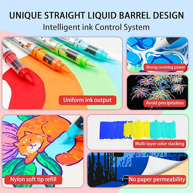 - 【Unique Straight Liquid Barrel Design:】 Acrylic paint markers with straight liquid ink filling, comes with intelligent ink control system, uniform and not easy to leak. 0.5-5 mm nylon soft tip brush nib, smooth and fluid painting, this acrylic marker pens is an art supplies to meet all your creative needs.
