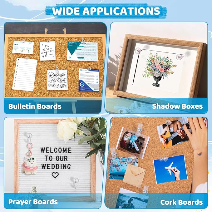 - 【Wide Applications】You can use these push pins to pin notes, posters, photos, memos, maps, postcards, and calendars on cork boards, bulletin boards, foam boards, cardboard, maps, and globes. Making exquisite DIY handmade crafts and hanging ornaments for school, office, home, factories, and exhibitions. Clear design bc the focus is on the photo or drawing not the pin!
