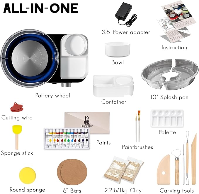 - Complete pottery wheel for kids beginners and teens: Including a full set of sculpting essentials like 2x6" Bats, 1 charging cable, 2 clay blocks, 5 sculpting tools, 2 paintbrushes, 1 palette, 1 Container, 1 Bowl, 12 vibrant paints, 1 sponge and 1 sponge stick, perfect for beginners.