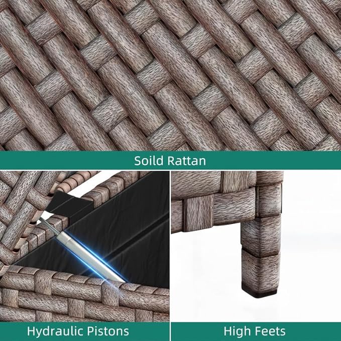 - All-weather deck box: Crafted from weather-proof rattan, this outdoor waterproof 260 gallon deck box is built to brave the elements. Water-repellent and sun-proof, it promises years of reliable use. The robust hydraulic pistons allow for smooth, effortless lifting