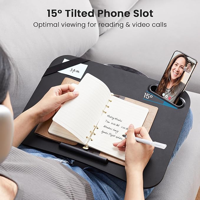 - 15° Angled Phone Slot: The cushioned lap desk enhances multitasking with a built-in 15° phone holder. Keep your smartphone at the ideal viewing angle for video calls or virtual meetings while you work.