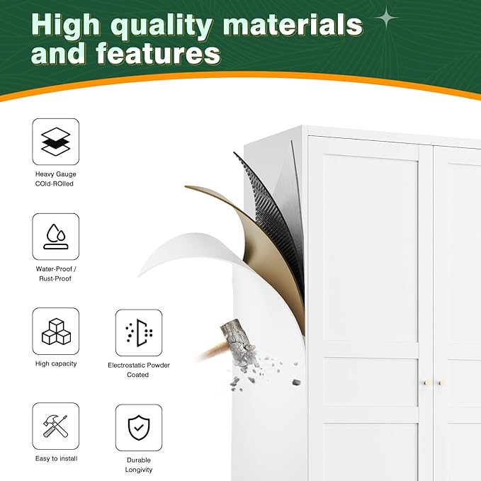 - Superior Materials : Our wardrobe is constructed from large thickened cold-rolled steel plates for exceptional strength and durability. The wardrobe is finished with an electrostatic powder coating, making it scratch resistant, wear resistant and easy to clean. This design is more durable than traditional wooden wardrobes.