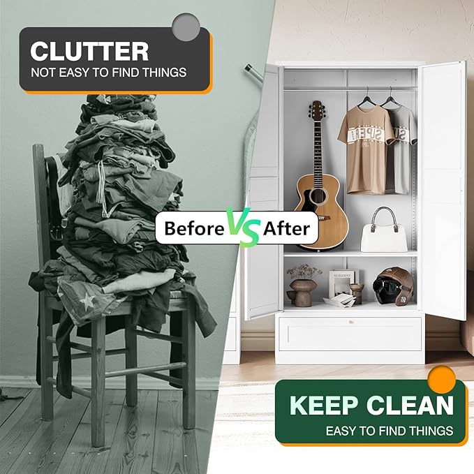 - Spacious and Flexible Storage:72"H×36"W×18"D. This tall wardrobe has a large interior with a dedicated hanging rod area and adjustable shelves.This wardrobe with Storage Drawer .The large storage capacity allows you to organise clothes, accessories, office supplies and more, increasing the functionality and flexibility of your space.
