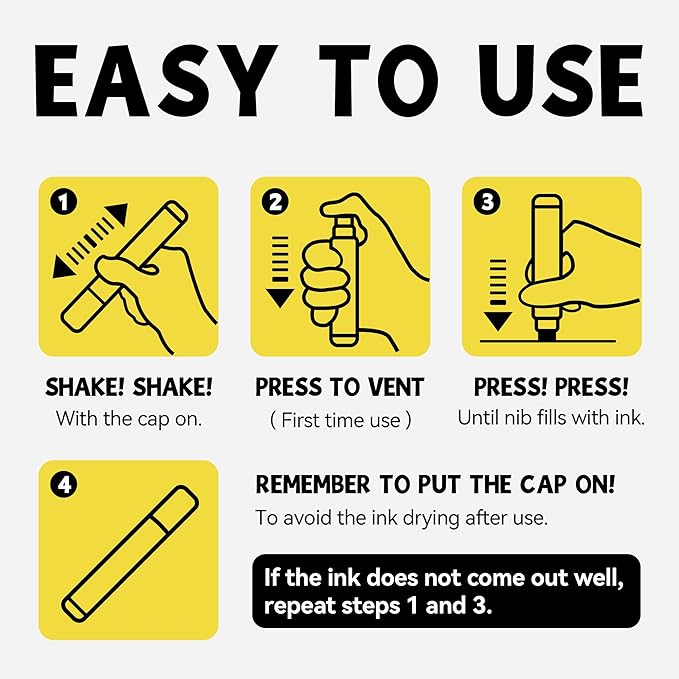 - Jumbo Permanent Markers Set: SRUOLOC jumbo yellow markers are made with the highest-quality water-based acrylic ink. That is waterproof, quick dry, long-lasting, and smooth ink flow