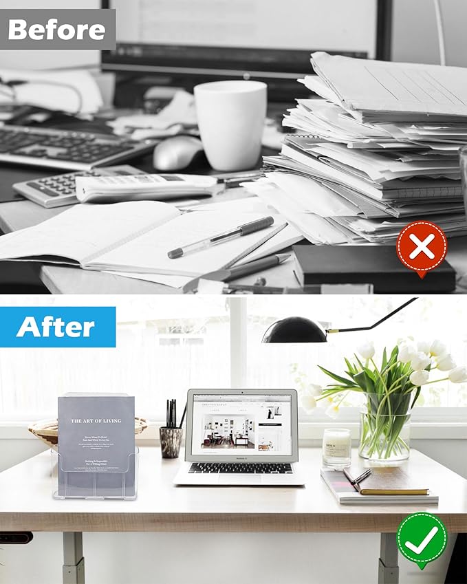 - Tabletop&Wall Mount: The display stand features a slanted back design for stability on desktop. The anti-slip slots keep your brochures neatly displayed and prevent the bottom from curling or warping. Two holes in the back for optional wall mount use