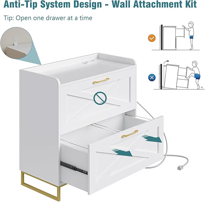 Lateral File Cabinet 2 Drawer File Cabinet with Charging Station for Legal/Letter/A4 Size Hanging Files, Modern Farmhouse Large Wood File Storage Cabinet for Home Office Furniture(White and Gold)