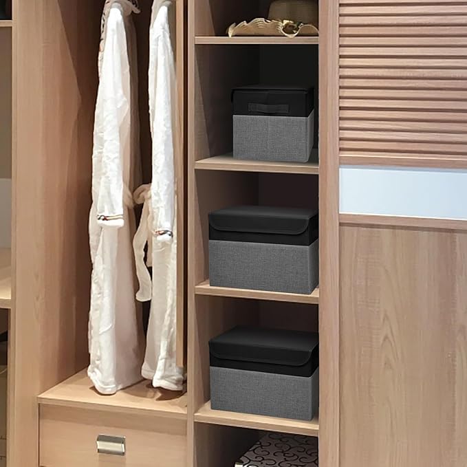 Large 22 Quart Linen Fabric Foldable Storage Bin Cube Organizer Basket with Flip-Top Lid & Handles, Clothes Blanket Box for Home, Office, Closet, Black & Gray, 4 Pack 14.6 x 9.5 x 9.5