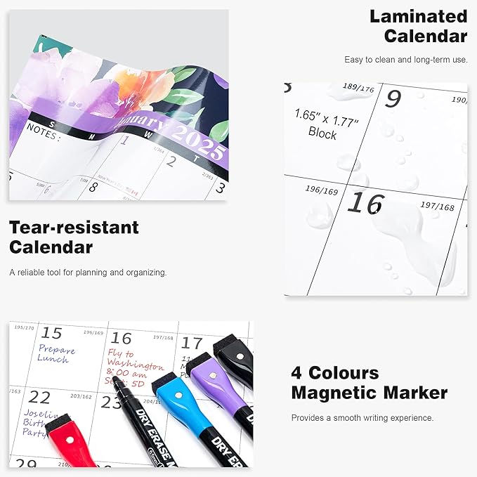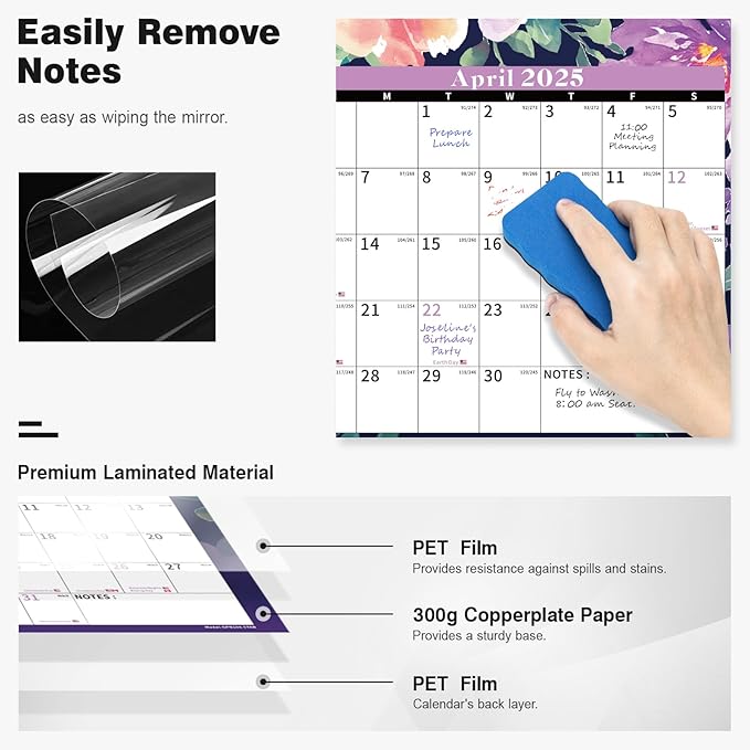 - ✨ Dry Erase Wall Calendar : is made of PET Film and 300 grams Copperplate Paper, providing a durable surface that resists scratches and smudges, while the sturdy Copperplate Paper backing keeps it in place without curling.