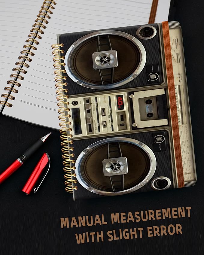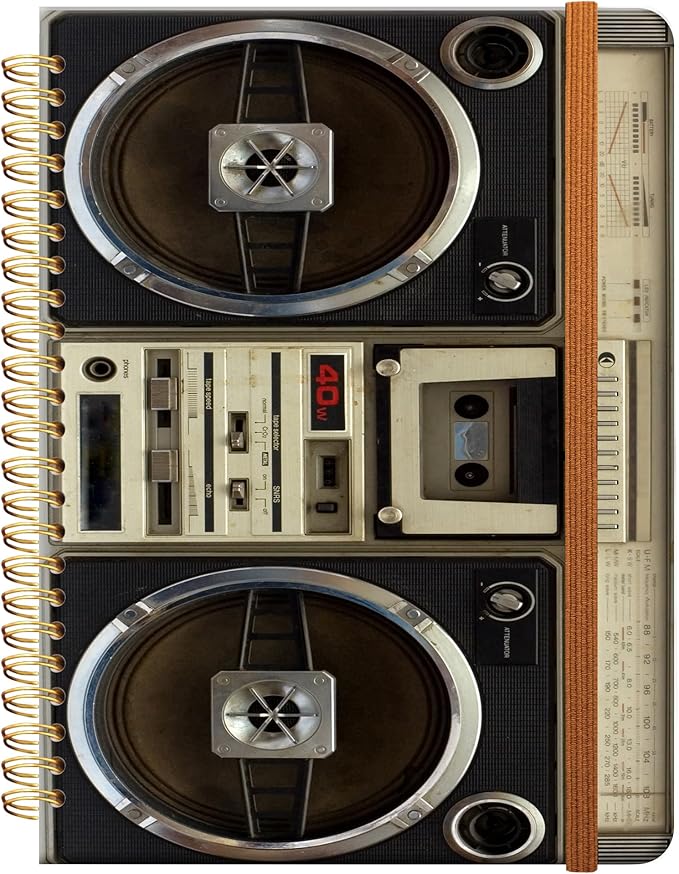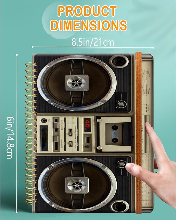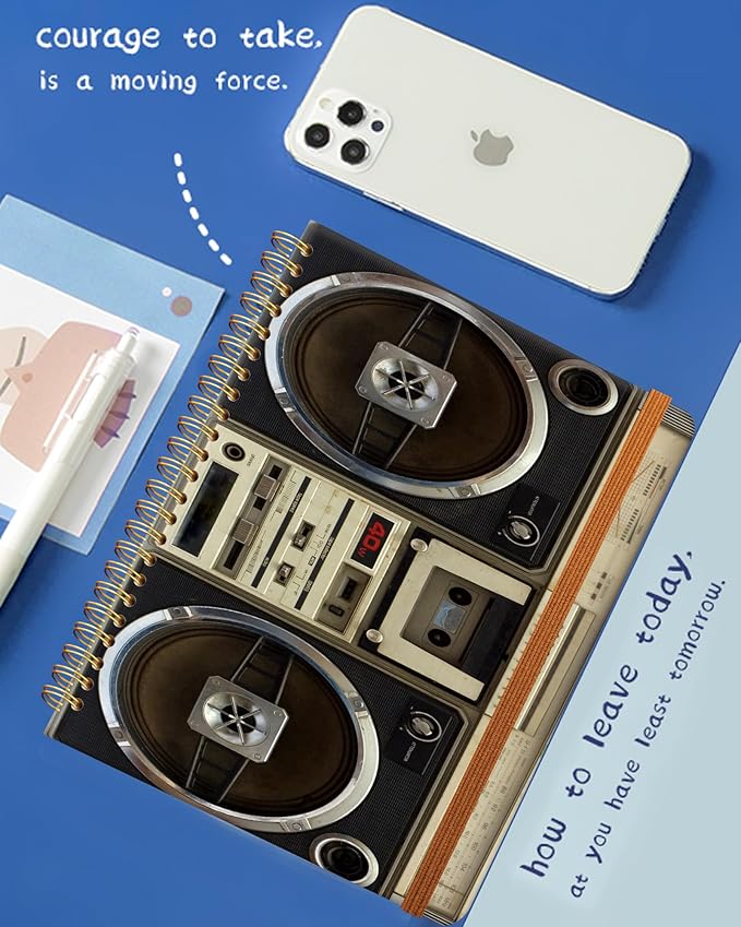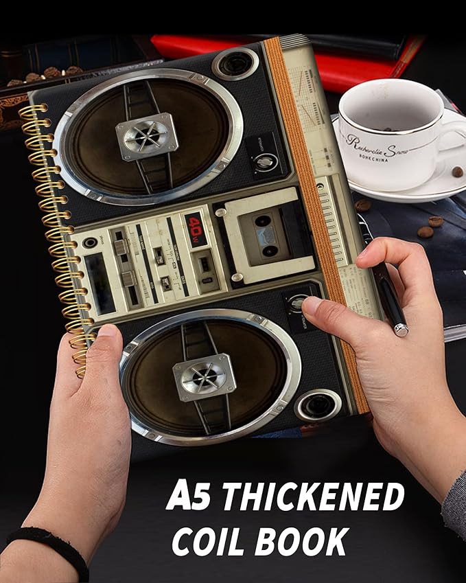 Ruled Spiral Writing Notebook,A5 Hardcover Lined College Journal for Women Lady,Fashion Puppy Watercolor Strong Twin-Wire Binding with Premium Paper,8.4" X 6",Perfect for School,Office,Home Gifts(Tape Recorder Vintage)