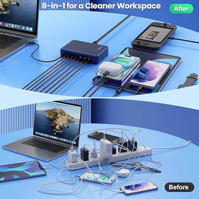 - 【8-in-1 Usb C Charger Block】Our USB charger provides multi charging options to meet your different needs. With 5*USB C ports and 3*USB A ports, no need for more adapters, you can use just one outlet to plug in laptops, tablets, smartphones, Bluetooth speakers and other small gadgets like earbuds, smartwatches, game consoles etc.Our USB C charging stations feature 8 independent output ports, ensuring all devices can charge simultaneously at full speed without power sharing and disconnection,this 8-in-1 charging station will reduce your accessories burden and help you create an organized and clean desktop.