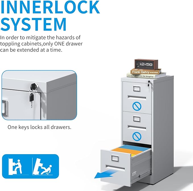 - 【Noiseless & Anti-Tipping Design】The smooth, quiet sliding rails make opening and closing drawers effortless and noise-free, allowing you to access your files without disturbing others in the workspace. The metal filing cabinet features a one-drawer-at-a-time mechanism, which prevents multiple drawers from being opened simultaneously. This design ensures the cabinet remains stable and reduces the risk of tipping, even when fully loaded. This thoughtful design ensures that your files are not only well-organized but also safely stored.