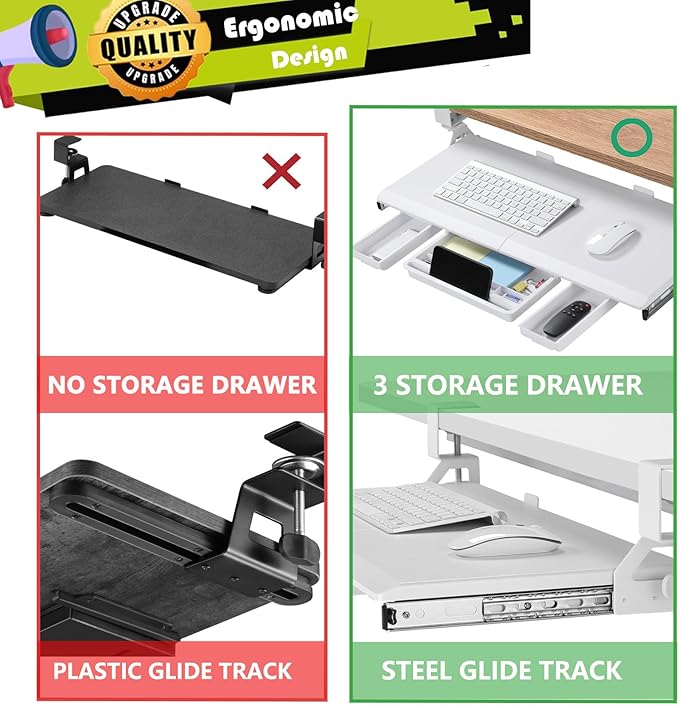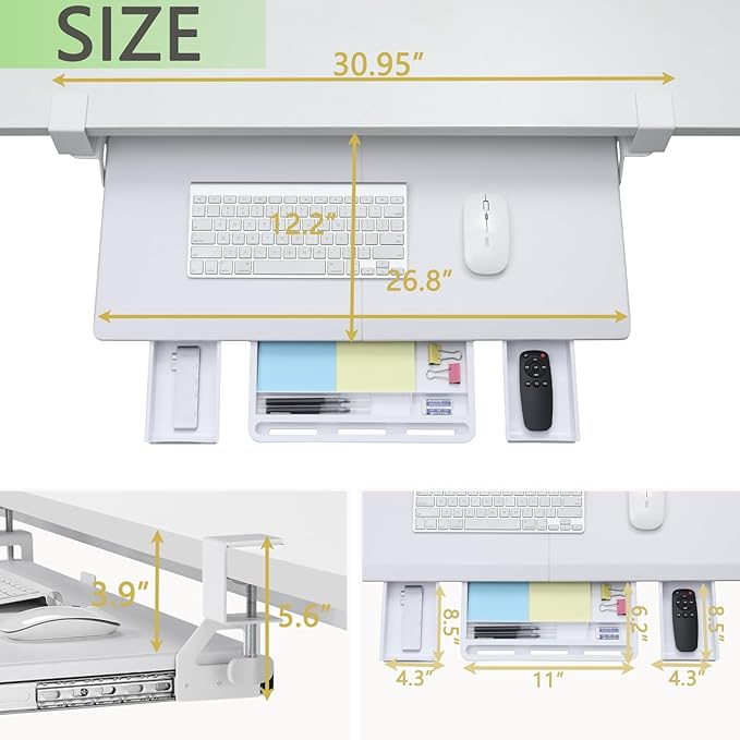 - Maximize Desk Space & 3 Drawers - The ETHU keyboard tray is designed to save desk space with its 26.77β (31.18" with clamps) x 12.2β size, allowing you to fit your keyboard, mouse, and small accessories beneath your desktop. Underneath the keyboard, 3 drawer storage adds valuable extra workspace for your phone and other items