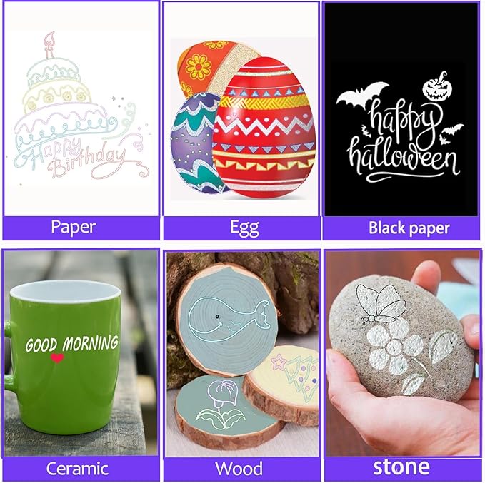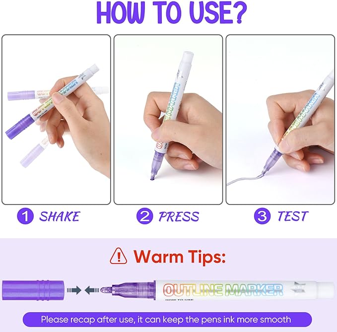 - 🎨Double Line Outline Markers: Double Line Outline Markers colours with double line and glitter effect. Shimmer Markers, Metallic Marker Pen ,This Glitter Pen can be suitable for greeting cards, graffiti, poster making, drawing, journaling, Art Crafts,DIY Photo Album and highlighting.Suitable for almost any surface, such as rock, ceramic, wood, glass,stone, etc.Design Flash Metal Font