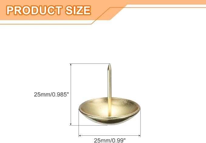 - Specifications: Material: Carbon steel; Color: Gold; Diameter of nails head: 25mm/0.99inch; Shank length: 25mm/0.985inch; Package Content: 50Pcs x Upholstery Tacks Nail Pins