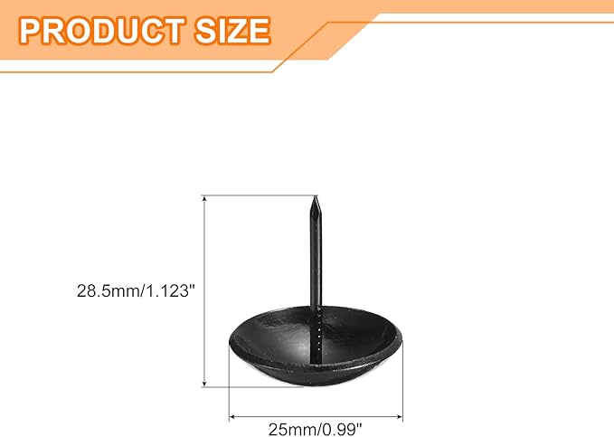 - Specifications: Material: Carbon steel; Color: Black; Diameter of nails head: 25mm/0.99inch; Shank length: 28.5mm/1.123inch; Package Content: 30Pcs x Upholstery Tacks Nail Pins
