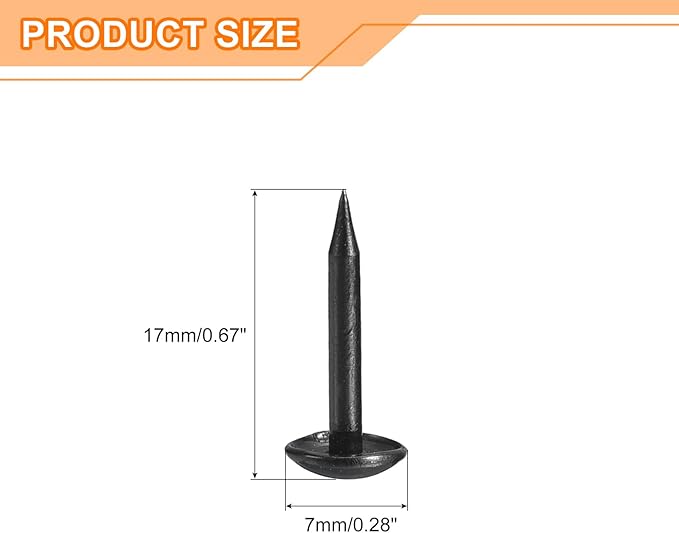 - Specifications: Material: Carbon steel; Color: Black; Diameter of nails head: 7mm/0.28inch; Shank length: 17mm/0.67inch; Package Content: 50Pcs x Upholstery Tacks Nail Pins