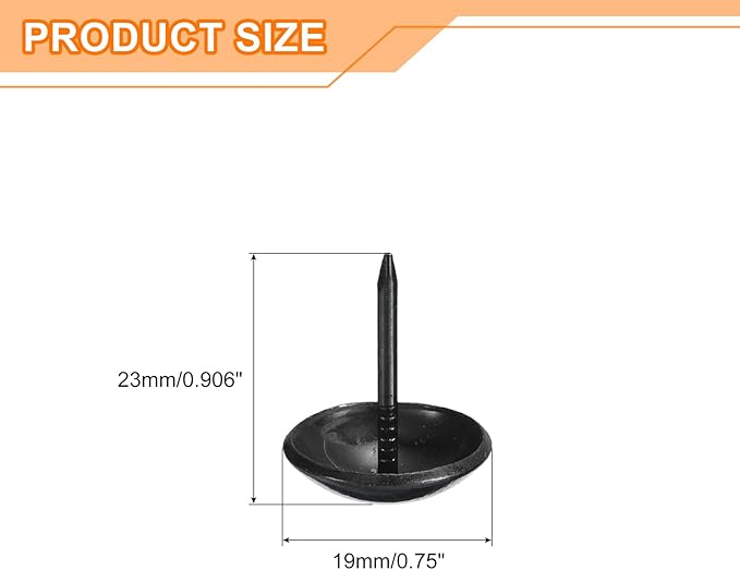 - Specifications: Material: Carbon steel; Color: Black; Diameter of nails head: 19mm/0.75inch; Shank length: 23mm/0.906inch; Package Content: 100Pcs x Upholstery Tacks Nail Pins