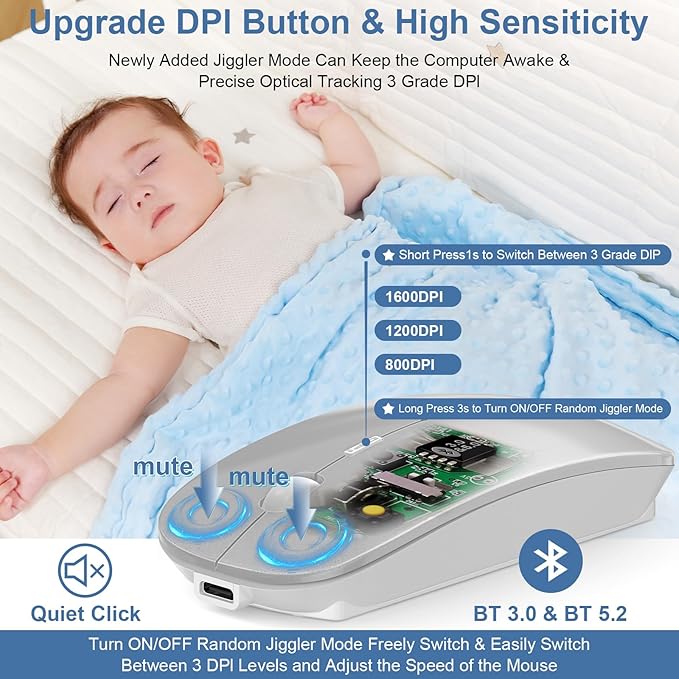 - [Upgrade Newly Added Jiggler Mode & Adjustable DPI]: Upgrade DPI button; Short press 1s to switch between 3 adjustable grade DIP levels optical accurately tracking mode (800DPI、1200DPI、1600DPI). Advanced optical tracking technology with quick click and responsiveness; Long Press 3s to Turn ON/OFF random jiggler mode(randomly move the mouse pointer irregularly). Preventing computer into sleep,keep screen active.suitable for Online video meeting、Downloading files、Game tasks、Online class、Online reading、Remote operation,etc. It keeps the computer active.