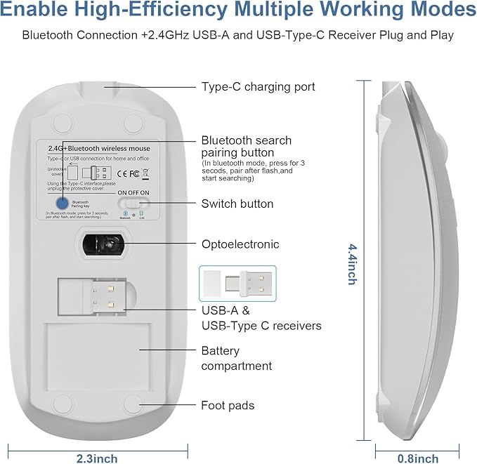 - Special Feature : Bluetooth 5.2 & Bluetooth 3.0 Switched Freely, Dual Mode Switching & Adjustable DPI with Jiggler Mode, Ergonomic Design & Lightweight Portable, Precise Optical Tracking & Rechargeable, Wireless 2.4GHz USB-A & 2.4GHz USB-C [Type-C] Receiver Plug-and-play Bluetooth 5.2 & Bluetooth 3.0 Switched Freely, Dual Mode Switching & Adjustable DPI with Jiggler Mode, Ergonomic Design & Lightweight Portable, Precise Optical Tracking… See more