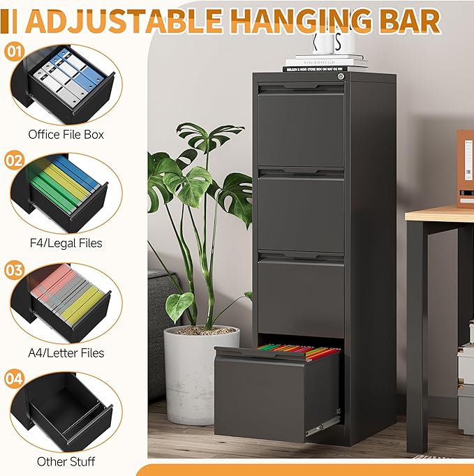 - 【Large Capacity】This vertical file cabinet for home office has large storage space, fully retractable ball bearing drawer slide rails for easy access to all folders, file drawers with adjustable hanging rods can hang A4 size, letter size or legal size hanging folders to make your files well organized.