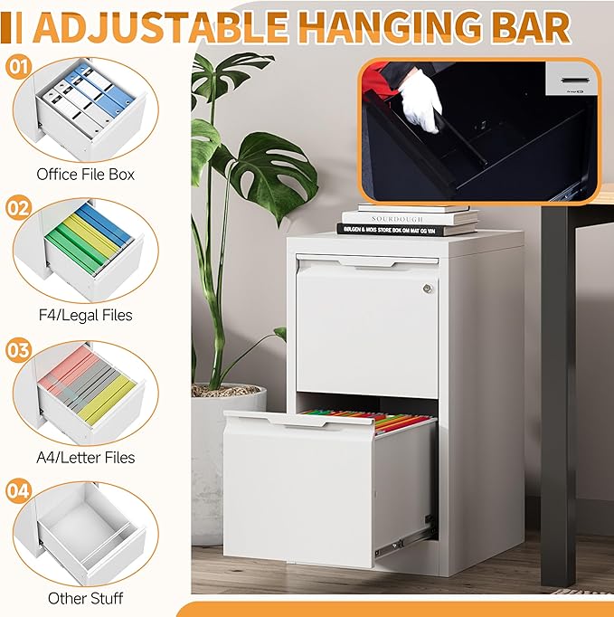 - 【Large Capacity】This vertical file cabinet for home office has large storage space, fully retractable ball bearing drawer slide rails for easy access to all folders, file drawers with adjustable hanging rods can hang A4 size, letter size or legal size hanging folders to make your files well organized.