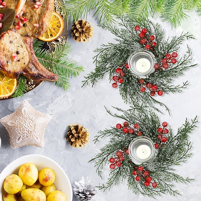 - Christmas Themed Design - Serlvan artificial candle rings are composed of red berries and green pine needle branches, covered with fake snow. It is beautifully designed complements for festive elements.