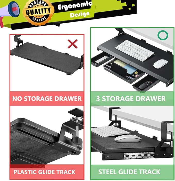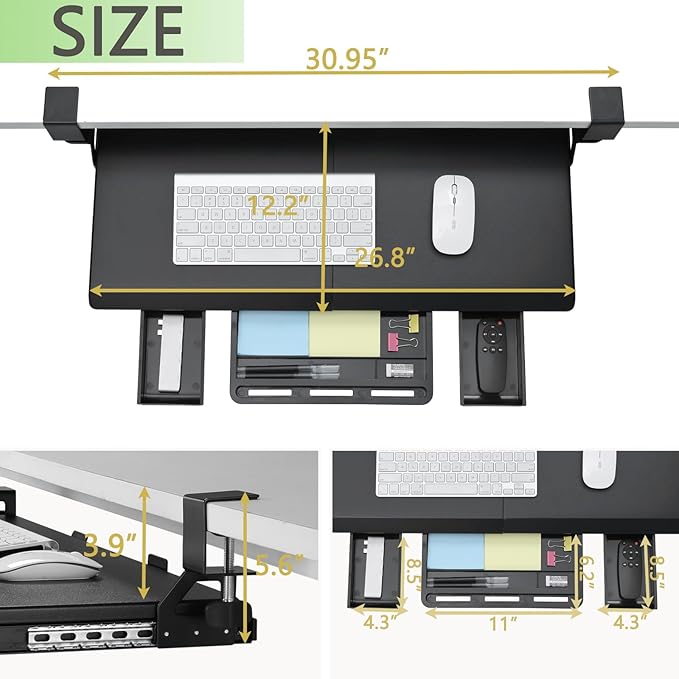 - Maximize Desk Space & 3 Drawers - The ETHU keyboard tray is designed to save desk space with its 26.77” (31.18" with clamps) x 12.2” size, allowing you to fit your keyboard, mouse, and small accessories beneath your desktop. Underneath the keyboard, 3 drawer storage adds valuable extra workspace for your phone and other items