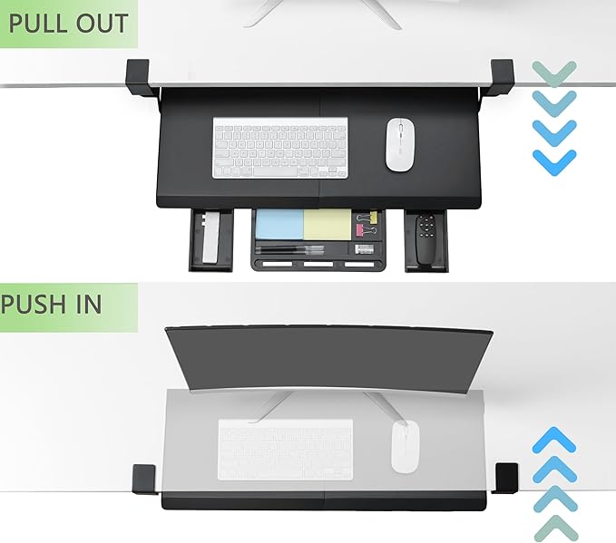 - Smooth Gliding Tracks - Retractable smooth sliding rail design allows the desk drawer to glide smoothly forward and backward. It encourages you to keep your arms and wrists in a neutral position and aids in the prevention of injuries caused by poor posture. Simply slide the tray under your desk when not in use and quickly pull it out when you need more space.