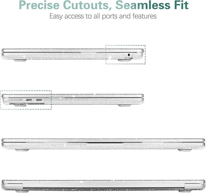 - Precise Cutouts: This clear glitter MacBook Air 15 inch case is designed to fit the original MacBook using micro-3D cutting technology. It has precise openings and cutouts for easy access to all ports and features. The transparent design complements the aesthetics of your MacBook and displays the Apple logo while providing a snug fit that feels like a second skin. Additionally, it opens and closes smoothly.