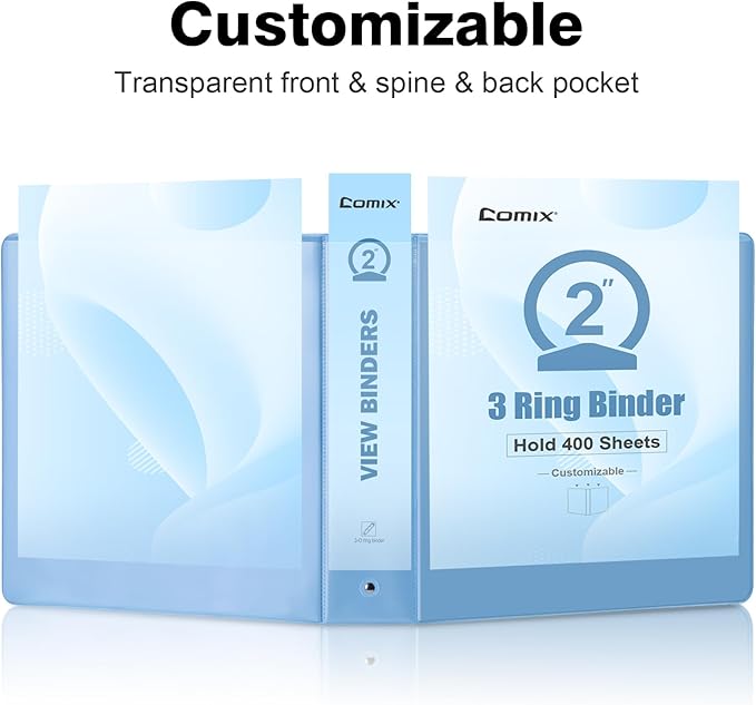 COMIX Standard 3 Ring Binder 2 inch with Clear View Cover, 2" Round Ring View Binder Holds 400 Sheets of US Letter Size Paper, 6 Pack (Pale Blue)