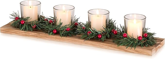 - Christmas Table Centerpiece: Elevate your holiday table with our exquisite Christmas Candle Holder. This wooden tray, measuring 16.5” holds 4 mini Christmas pine wreaths around tea light holders, blending natural wood with holiday greenery for a classic touch.