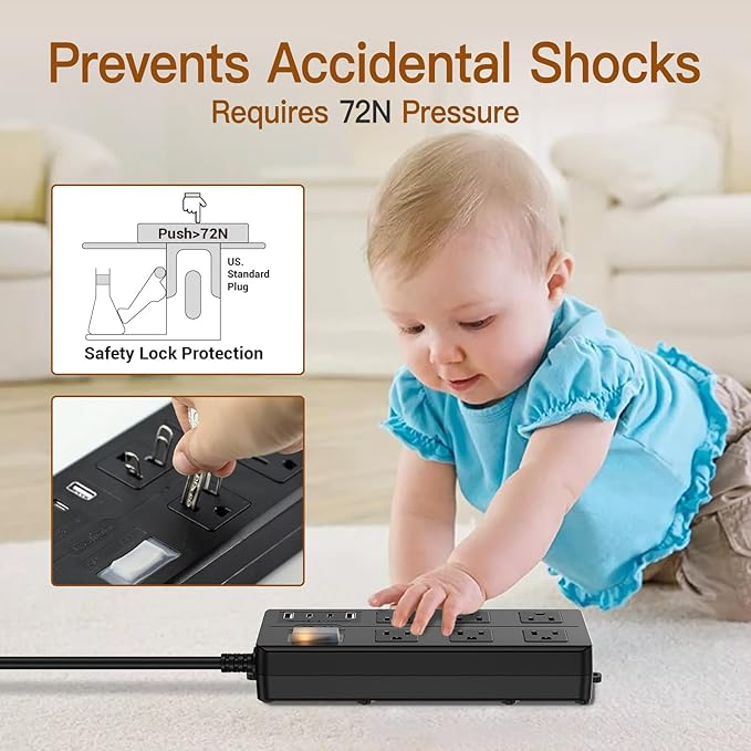 - Electric Shockproof Outlet Strip: Designed for outdoor use,this shockproof strip enhances safety by preventing objects from reaching the inner circuit;Tailored for US plugs;Note: Plug insertion may require extra force due to the protective design