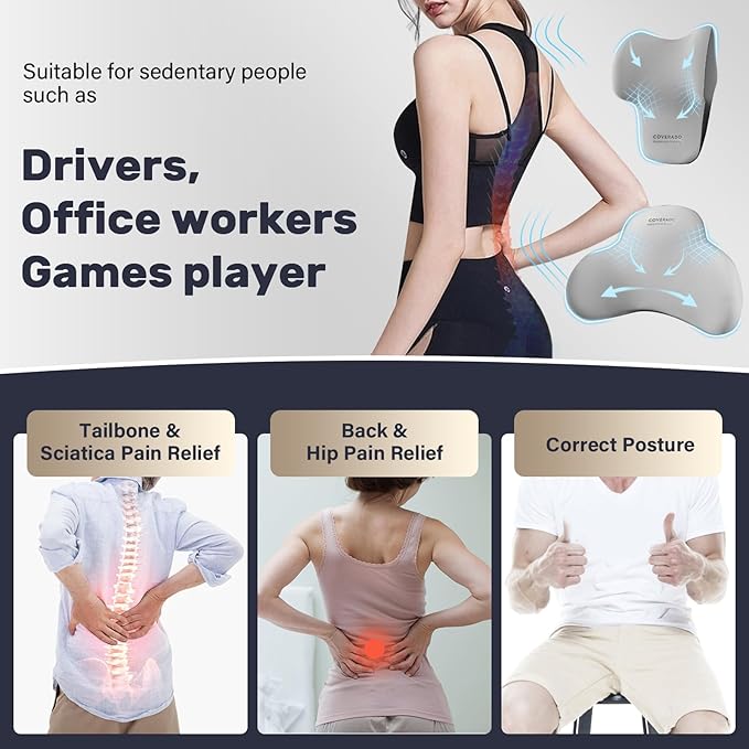Coverado Lumbar Support and Car Neck Pillow, Ergonomic Memory Foam Desk Chair Cushion and Headrest Pillow for Car Office Chair, Sciatica & Neck & Tailbone Cushion-Black&Gray