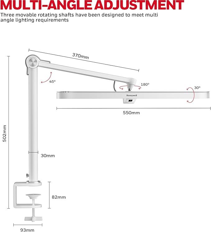 - Comfortable Natural Light: Honeywell HWT-05B02 desk lamp with clamp features a Sunturalux chip and 108 full-spectrum LED beads, offering a color rendering index (CRI(Ra)) ≥97. This design enables the LED desk lamp to mimic natural light, ensuring both comfortable illumination and accurate color reproduction.Enjoy the sunlight at home.