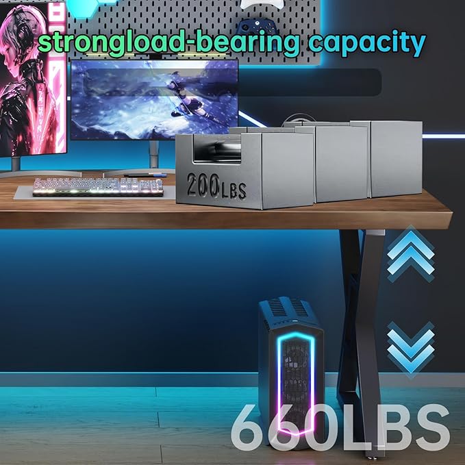 - Excellent Material: The gaming desk uses a high-quality, thick solid wood desktop with a sturdy metal frame, which not only provides excellent load-bearing capacity, but also prevents the desktop from bending and deforming. The unique geometric design allows the pc desk to remain stable in any situation, and it will not shake or tilt even when performing high-intensity work or placing a large number of items.