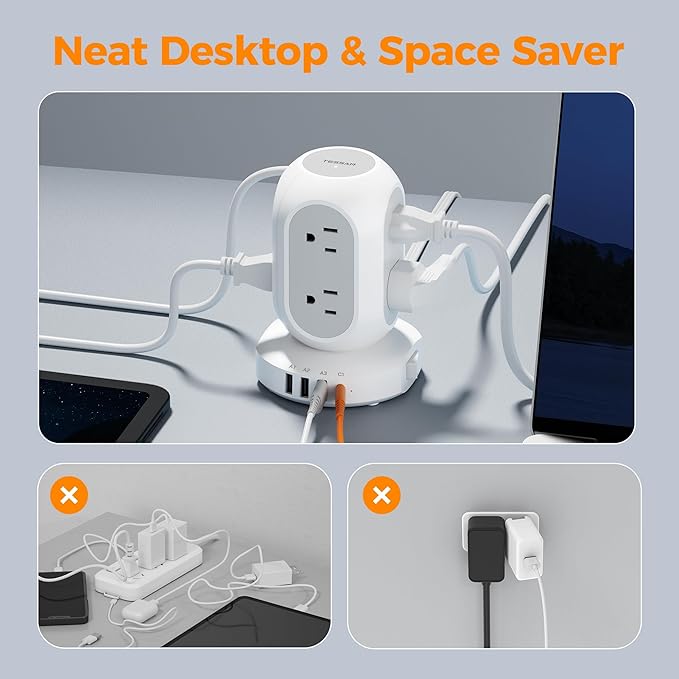 - Power Strip with USB Ports: TESSAN power tower is equipped with 4 USB ports to meet the charging needs of different USB devices (Total 3A, 2.4A each USB A Max); 15W USB C outlet can quickly charge phone, tablet and other devices