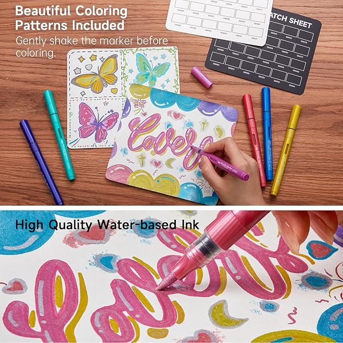 - 【24 Metallic Colors & Convenient Accessories】: Shuttle Art acrylic paint markers set comes with 24 vibrant metallic colors to choose from, the gorgeous metallic ink is waterproof and fade-resistant, perfectly suited to your needs for high standard. The marker set also contains a portable box, 2 color charts and 2 coloring patterns, a hassle-free choice for your creating.