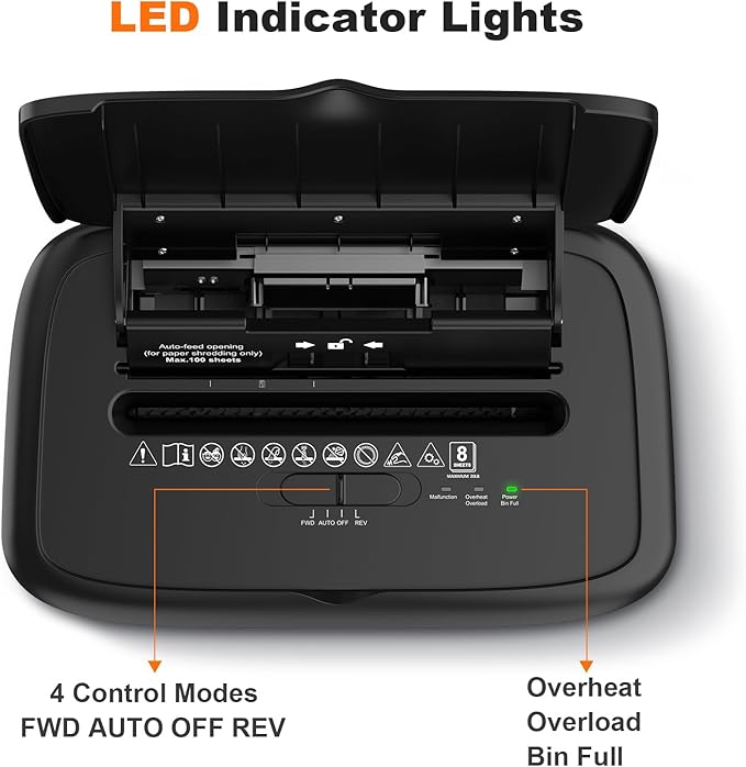 - Auto & Manual Shredding: Home office shredders can handle any shredding task with 2 modes. 100 sheets auto shredding (Shredded paper only), making it easy for bulk shredding. And 8 sheets manual shredding capacity (Shredded cards, staples and clips)