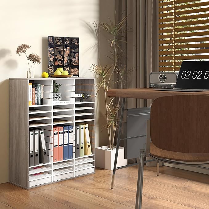 EasyPAG Mail Organizer Countertop, Wood Literature Organizer with Adjustable Shelves, Student Classroom Mailbox for School, Desktop Paper Sorter for Office Home, 36 Compartments, Retro Gray/White