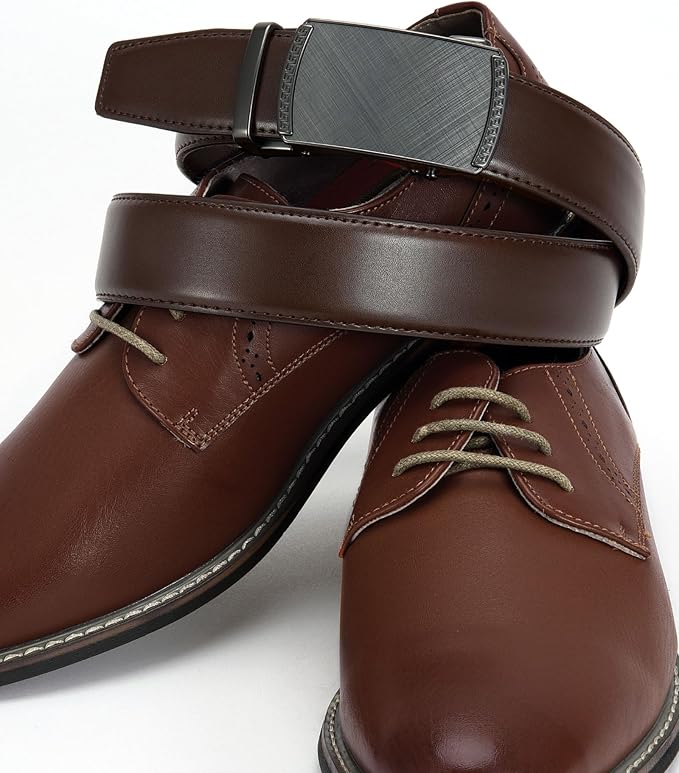 • Effortless to Use: Experience the ultimate convenience with our brown leather belt. Simply slide it into the sliding buckle, pull it through, and the click-it buckle automatically locks in place. Releasing the belt is just as easy - gently push the lever on the side of the automatic buckle, and the lock snaps shut. Enjoy the seamless simplicity and smoothness of our ratchet belt design.