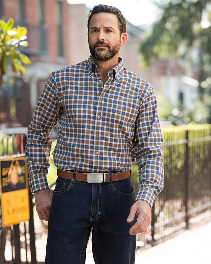 - Effortless to Use: Experience the ultimate convenience with our brown leather belt. Simply slide it into the sliding buckle, pull it through, and the click-it buckle automatically locks in place. Releasing the jeans belt is just as easy - gently push the lever on the side of the automatic buckle, and the lock snaps shut. Enjoy the seamless simplicity and smoothness of our slide belt design.